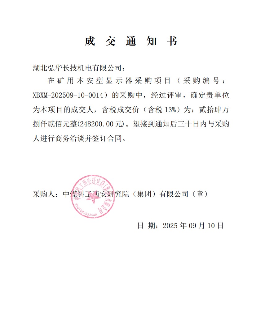 Notification of Winning the Bid from CCTEG Xi\'an Research Institute (Group) Co., Ltd.(Bid No.:XBXM-202509-10-0014)